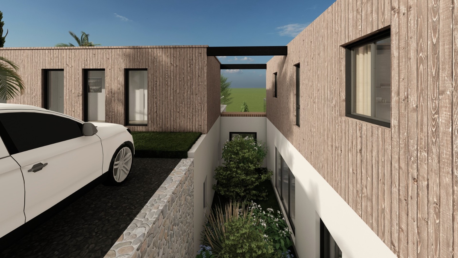 Croisement Axial s'implante au croisement de deux rues et s'ancre dans la pente naturelle du terrain. Le projet tire parti de cette topographie pour organiser la maison en deux volumes distincts, reliés par un espace central couvert. Cette articulation permet une lecture claire du bâti et favorise des cadrages variés sur le paysage environnant. L'ensemble s'intègre dans le tissu pavillonnaire tout en affirmant une identité contemporaine, par le jeu des volumes, la matérialité sobre et l'équilibre entre minéral et végétal.